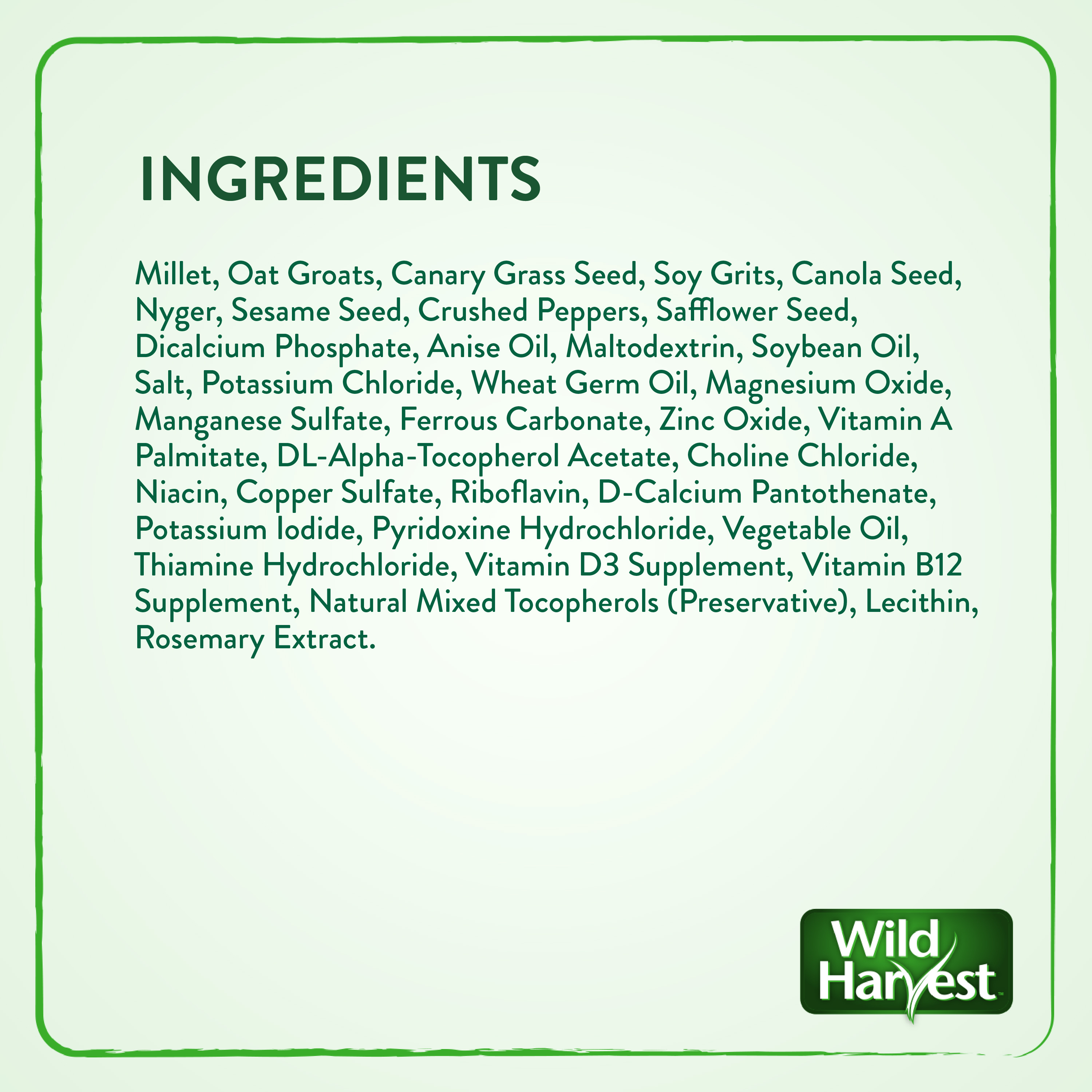 DIETARY SUPPLEMENT: Wild Harvest® Healthy Benefits Molting Supplement is intended for intermittent or supplemental feeding, not to be the sole source of nutrition.